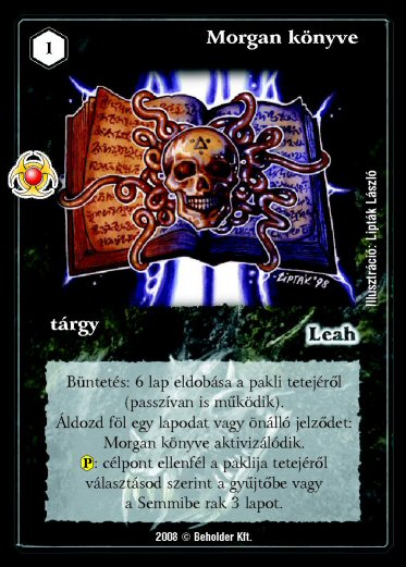 Szöveg: Büntetés: 6 lap eldobása a pakli tetejéről (passzívan is működik). Áldozd föl egy lapodat vagy önálló jelződet: Morgan könyve aktivizálódik. (P): célpont ellenfél a paklija tetejéről választásod szerint a gyűjtőbe vagy a Semmibe rak 3 lapot.
