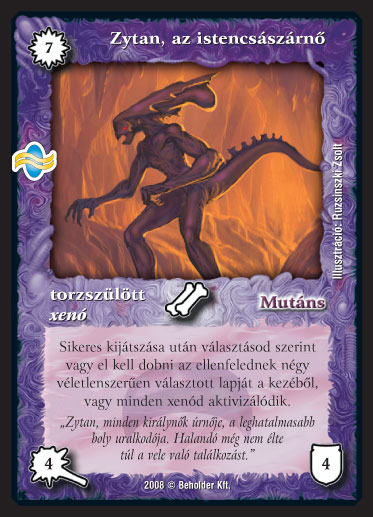Szöveg: Sikeres kijátszása után választásod szerint vagy el kell dobni az ellenfelednek négy véletlenszer?en választott lapját a kezéb?l, vagy minden xenód aktivizálódik.