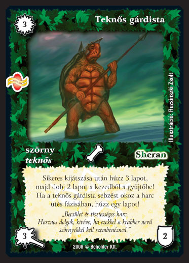 Szöveg: Sikeres kijátszása után húzz 3 lapot, majd dobj 2 lapot a kezedb?l a gy?jt?be! Ha a tekn?s gárdista sebzést okoz a harc ütés fázisában, húzz egy lapot!
