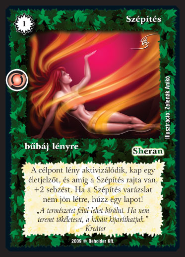Szöveg: A célpont lény aktivizálódik, kap egy életjelzőt, és amíg a Szépítés rajta van, +2 sebzést. Ha a Szépítés varázslat nem jön létre, húzz egy lapot!