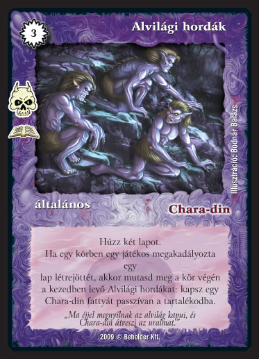 Szöveg: Húzz két lapot. Ha egy körben egy játékos megakadályozta egy lap létrejöttét, akkor mutasd meg a kör végén a kezedben levő Alvilági hordákat: kapsz egy Chara-din fattyát passzívan a tartalékodba.