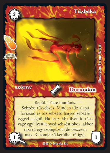 Szöveg: Repül. Tűzre immúnis. Sebzése tűzsebzés. Minden tűz alapú forrásod és tűz sebzésű lényed sebzése eggyel megnő. Ha használsz ilyen forrást, vagy egy ilyen lényed sebzést okoz, akkor rakj rá egy izomjelzőt (de összesen max. 3 izomjelző kerülhet rá így).