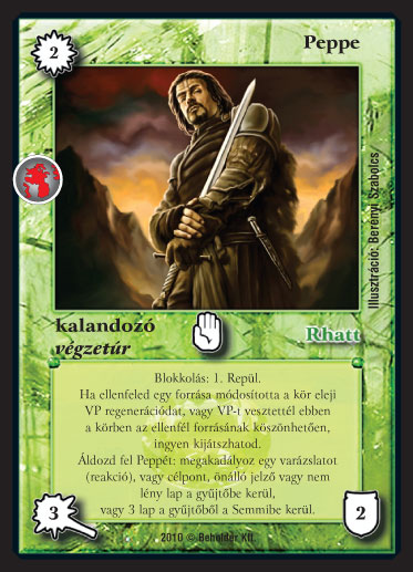 Szöveg: Blokkolás: 1. Repül. Ha ellenfeled egy forrása módosította a kör eleji VP regenerációdat, vagy VP-t vesztettél ebben a körben az ellenfél forrásának köszönhet?en, ingyen kijátszhatod. Áldozd fel Peppét: megakadályoz egy varázslatot (reakció), vagy célpont, önálló jelz? vagy nem lény lap a gy?jt?be kerül, vagy 3 lap a gy?jt?b?l a Semmibe kerül.