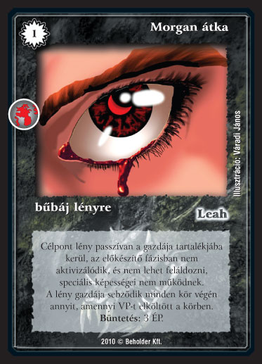 Szöveg: Célpont lény passzívan a gazdája tartalékjába kerül, az el?készít? fázisban nem aktivizálódik és nem lehet feláldozni, speciális képességei nem m?ködnek. A lény gazdája sebz?dik minden kör végén annyit, amennyi VP-t elköltött a körben. Büntetés: 3 ÉP.