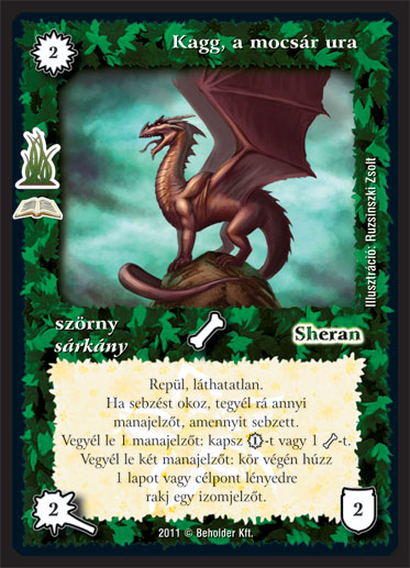 Szöveg: Repül, láthatatlan. Ha sebzést okoz, tegyél rá annyi manajelz?t, amennyit sebzett. Vegyél le 1 manajelz?t: kapsz 1_VP-t vagy 1 _*-t. Vegyél le két manajelz?t: kör végén húzhatsz 1 lapot vagy célpont lényedre rakj egy izomjelz?t.
