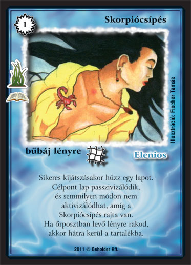 Szöveg: Sikeres kijátszásakor húzz egy lapot. Célpont lap passzivizálódik, és semmilyen módon nem aktivizálódhat, amíg a Skorpiócsípés rajta van. Ha ?rposztban lev? lényre rakod, akkor hátra kerül a tartalékba.