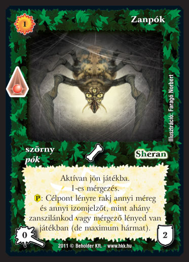 Kiadás: Zanszilánkok Gyakoriság: gyakori Lapszín (isten): Sheran Típus: szörny Altípus: pók Szöveg: Aktívan jön játékba. 1-es mérgezés. (P): Célpont lényre rakj annyi méreg és annyi izomjelzőt, mint ahány zanszilánkod vagy mérgező lényed van játékban (de maximum hármat). Illusztráció: Faragó Norbert