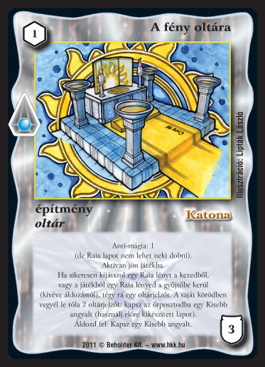 Szöveg: Anti-mágia: 1 (de Raia lapot nem lehet neki dobni) Aktívan jön játékba. Ha sikeresen kijátszol egy Raia lényt a kezedből, vagy a játékból egy Raia lényed a gyűjtőbe kerül (kivéve áldozástól), tégy rá egy oltárjelzőt. A saját körödben vegyél le róla 2 oltárjelzőt: kapsz az őrposztodba egy Kisebb angyalt (használj előre kikészített lapot). Áldozd fel: Kapsz egy Kisebb angyalt.