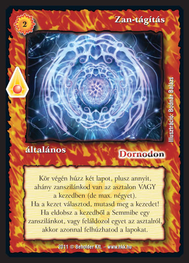 Szöveg: Kör végén húzz két lapot, plusz annyit, ahány zanszilánkod van az asztalon VAGY a kezedben (de max. négyet). Ha a kezet választod, mutasd meg a kezedet! Ha eldobsz a kezedből a Semmibe egy zanszilánkot, vagy feláldozol egyet az asztalról, akkor azonnal felhúzhatod a lapokat.