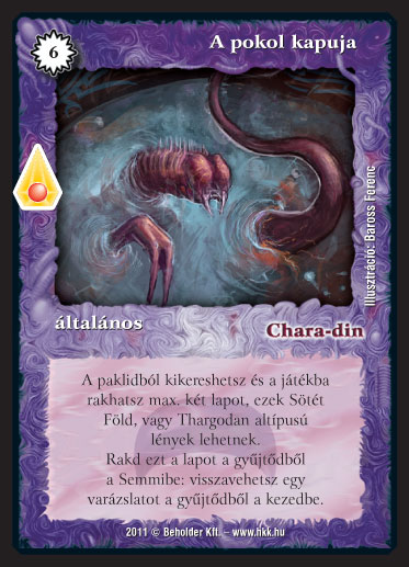Szöveg: A paklidból kikereshetsz és a játékba rakhatsz max. két lapot, ezek Sötét Föld, vagy Thargodan altípusú lények lehetnek. Rakd ezt a lapot a gyűjtődből a Semmibe: visszavehetsz egy varázslatot a gyűjtődből a kezedbe.