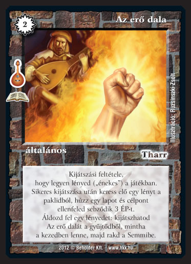 Szöveg: Kijátszási feltétele, hogy legyen lényed ("énekes") a játékban. Sikeres kijátszása után keress el? egy lényt a paklidból, húzz egy lapot és célpont ellenfeled sebz?dik 3 ÉP-t. Áldozd fel egy lényedet: kijátszhatod Az er? dalát a gy?jt?db?l, mintha a kezedben lenne, majd rakd a Semmibe.