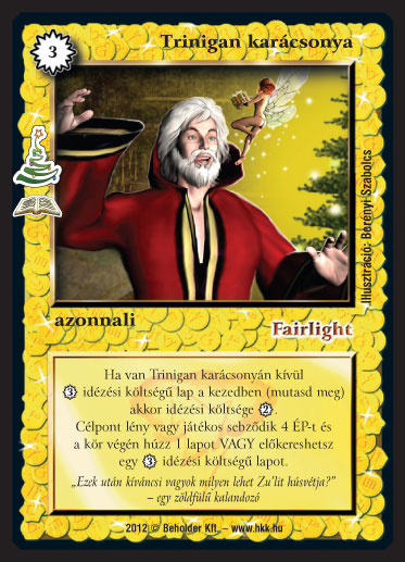 Szöveg: Ha van Trinigan karácsonyán kívül 3_VP idézési költség? lap a kezedben (mutasd meg) akkor idézési költsége 2_VP. Célpont lény vagy játékos sebz?dik 4 ÉP-t és a kör végén húzz 1 lapot VAGY el?kereshetsz egy 3_VP idézési költség? lapot.