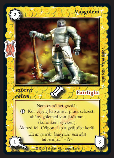 Szöveg: Nem cserélhet gazdát. 1_VP: Kör végéig kap annyi plusz sebzést, ahány gólemed van játékban. (körönként egyszer). Áldozd fel: Célpont lap a gyűjtőbe kerül.