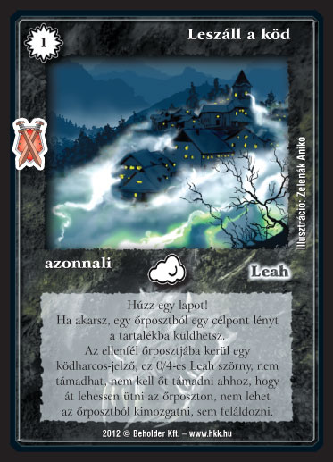 Szöveg: Húzz egy lapot! Ha akarsz, egy őrposztból egy célpont lényt a tartalékba küldhetsz. Az ellenfél őrposztjába kerül egy ködharcos-jelző, ez 0/4-es Leah szörny, nem támadhat, nem kell őt támadni ahhoz, hogy át lehessen ütni az őrposzton, nem lehet az őrposztból kimozgatni, sem feláldozni.