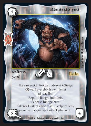Szöveg: Ha van yetid játékban, idézési költsége 2_VP-vel kevesebb és nem lehet rá reagálni. Repül. Hidegre immúnis. Sebzése hidegsebzés. Sikeres kijátszásakor max. 2 célpont lény passzívan a gazdája tartalékjába kerül.