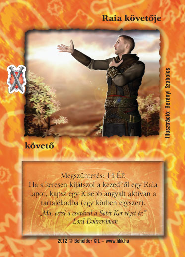 Szöveg: Megszüntetés: 14 ÉP. Ha sikeresen kijátszol a kezedből egy Raia lapot, kapsz egy Kisebb angyalt (használj el?re kikészített lapot) aktívan a tartalékodba (egy körben egyszer).