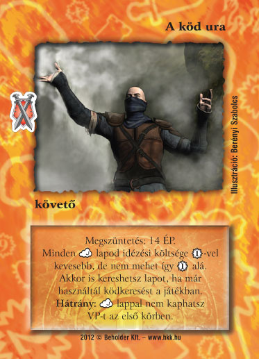 Szöveg: Megszüntetés: 14 ÉP. Minden _köd lapod idézési költsége 1_VP-vel kevesebb, de nem mehet így 1_VP alá. Akkor is kereshetsz lapot, ha már használtál ködkeresést a játékban. Hátrány: _köd lappal nem kaphatsz VP-t az első körben.