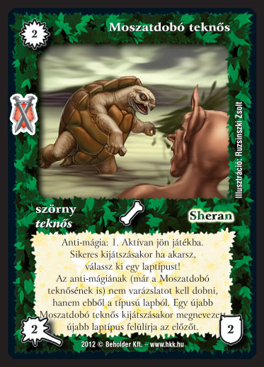 Szöveg: Anti-mágia: 1. Aktívan jön játékba. Sikeres kijátszásakor ha akarsz, válassz ki egy laptípust! Az anti-mágiának (már a Moszatdobó teknősének is) nem varázslatot kell dobni, hanem ebből a típusú lapból. Egy újabb Moszatdobó teknős kijátszásakor megnevezett újabb laptípus felülírja az előzőt.
