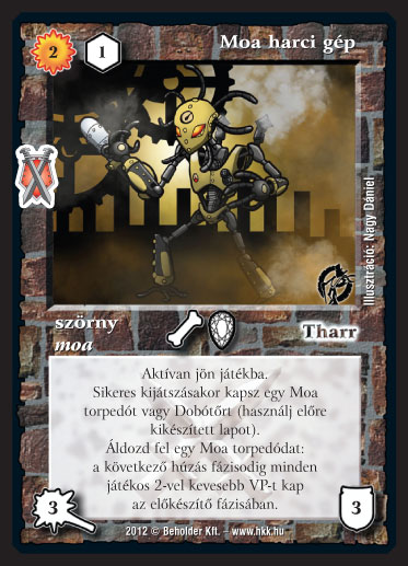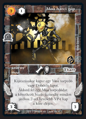 Szöveg: Aktívan jön játékba. Sikeres kijátszásakor kapsz egy Moa torpedót vagy Dobótőrt (használj előre kikészített lapot). Áldozd fel egy Moa torpedódat: a következő húzás fázisodig minden játékos 2-vel kevesebb VP-t kap az előkészítő fázisában.