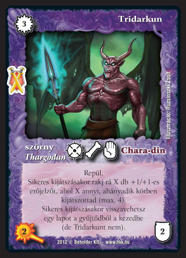 Szöveg: Repül. Sikeres kijátszásakor rakj rá X db +1/+1-es erőjelzőt, ahol X annyi, ahányadik körben kijátszottad (max. 4). Sikeres kijátszásakor visszavehetsz egy lapot a gyűjtődből a kezedbe (de Tridarkunt nem).