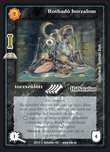 Szöveg: 4-es mérgezés. Ha ellenfeled sikeresen kijátszott egy lapot, akkor veszít annyi ÉP-t és VP-t, amennyi méregjelző van a játékban levő lényeken (de max. 9-et). 1_VP, vagy rakj egy mérgező lényt a gyűjtődből a Semmibe: célpont lényről lekerül általad választott számú méregjelző. Hátrány: sikeres kijátszása után rakj rá egy méregjelzőt.