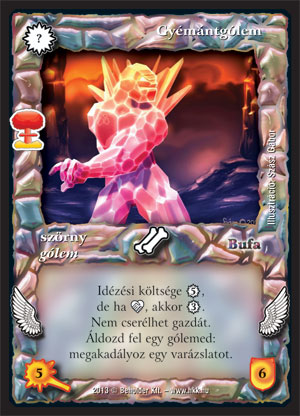 Szöveg: Idézési költsége 5_VP, de ha _etnikum, akkor 3_VP. Nem cserélhet gazdát. Áldozd fel egy gólemed: megakadályoz egy varázslatot.