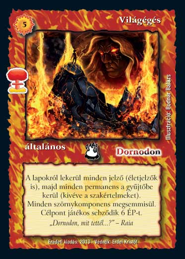 Szöveg: A lapokról lekerül minden jelző (életjelzők is), majd minden permanens a gyűjtőbe kerül (kivéve a szakértelmeket). Minden szörnykomponens megsemmisül. Célpont játékos sebződik 6 ÉP-t.