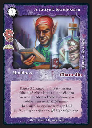 Szöveg: Kapsz 3 Chara-din fattyát (használj előre kikészített lapot) a tartalékodba passzívan, ebben a körben semmilyen módon nem aktivizálódhatnak. Ha akarsz, az egyikre tégy egy háló jelzőt, amíg ez rajta van, _háló képességet kap.