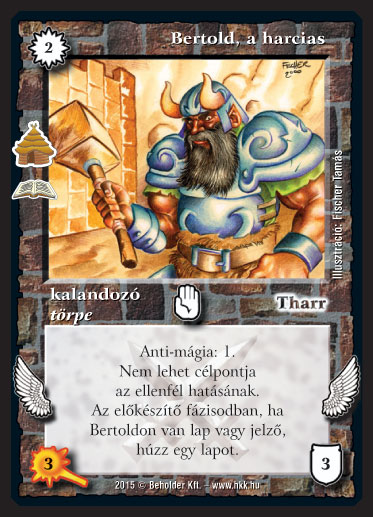 Szöveg: Anti-mágia: 1. Nem lehet célpontja az ellenfél hatásának. Az előkészítő fázisodban, ha Bertoldon van lap vagy jelző, húzz egy lapot.