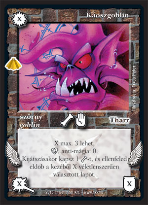 Szöveg: X max. 3 lehet. _etnikum, anti-mágia: 0. Kijátszásakor kapsz 1 _*-t, és ellenfeled eldob a kezéből X véletlenszerűen választott lapot.
