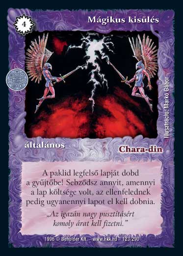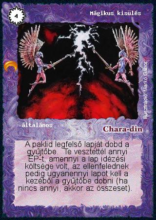 Szöveg: A paklid legfelső lapját dobd a gyűjtőbe. Te vesztettél annyi ÉP-t, amennyi a lap idézési költsége volt, az ellenfelednek pedig ugyanennyi lapot kell a kezéből a gyűjtőbe dobni (ha nincs annyi, akkor az összeset).
