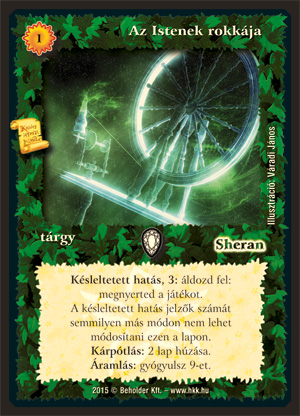 Szöveg: Késleltetett hatás, 3: áldozd fel: megnyerted a játékot. A késleltetett hatás jelzők számát semmilyen más módon nem lehet módosítani ezen a lapon. Kárpótlás: 2 lap húzása. Áramlás: gyógyulsz 9 ÉP-t.