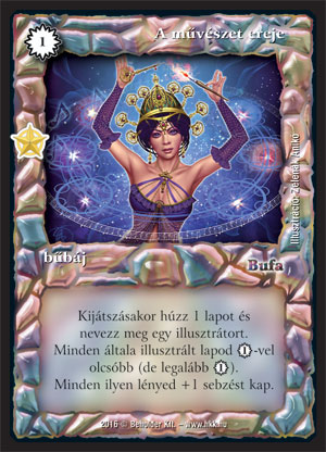Szöveg: Kijátszásakor húzz 1 lapot és nevezz meg egy illusztrátort (a névben az i és y betű ugyanannak számít). Minden általa illusztrált lapod 1_VP-vel olcsóbb (de legalább 1_VP). Minden ilyen lényed +1 sebzést kap.
