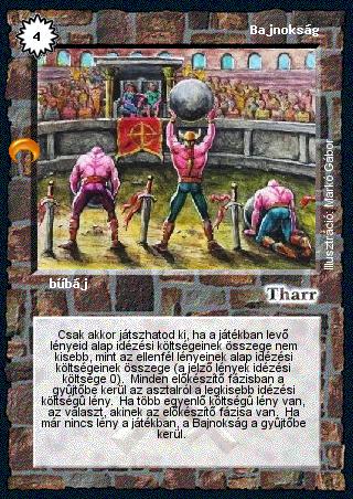 Szöveg: Csak akkor játszhatod ki, ha a játékban levő lényeid alap idézési költségeinek összege nem kisebb, mint az ellenfél lényeinek alap idézési költségeinek összege (a jelző lények idézési költsége 0). Minden előkészítő fázisban a gyűjtőbe kerül az asztalról a legkisebb idézési költségű lény. Ha több egyenlő költségű lény van, az választ, akinek az előkészítő fázisa van. Ha már nincs lény a játékban, a Bajnokság a gyűjtőbe kerül.