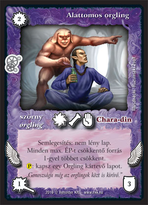 Szöveg: Semlegesítés: nem lény lap. Minden max. ÉP-t csökkentő forrás 1-gyel többet csökkent. (P): kapsz egy Orgling kártevő lapot passzívan.