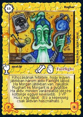 Szöveg: Kihozásának feltétele, hogy legyen játékban három aktív Fairlight lapod. Ha Morgan játékban van, rakjátok Rughart és Morgant is a gyűjtőbe. Ha aktív, minden varázslatod idézési költsége eggyel kevesebb. 3 VP: Húzz egy lapot. (Ez a képesség csak aktívan használható. ).