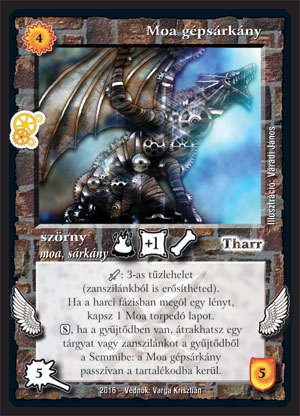 Szöveg: _+: 3-as tűzlehelet (zanszilánkból is erősítheted). Ha a harci fázisban megöl egy lényt, kapsz 1 Moa torpedó lapot. (S), ha a gyűjtődben van, átrakhatsz egy tárgyat vagy zanszilánkot a gyűjtődből a Semmibe: a Moa gépsárkány passzívan a tartalékodba kerül.