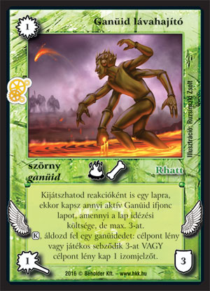 Szöveg: Kijátszhatod reakcióként is egy lapra, ekkor kapsz annyi aktív Ganüid ifjonc lapot, amennyi a lap idézési költsége, de max. 3-at. (K), áldozd fel egy ganüidedet: célpont lény vagy játékos sebződik 3-at VAGY célpont lény kap 1 izomjelzőt.