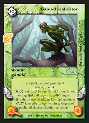 Szöveg: X a játékban lévő ganüidjeid száma, max. 4. (S), 1_VP: rakj játékba egy Ganüid ifjonc lapot, és a gyűjtődből vagy a kezedből ingyen kijátszhatsz egy fix idézési költségű ganüidet VAGY kikereshetsz egy avatárt a kiegészítő paklidból (kivéve Ganüid realizátort).