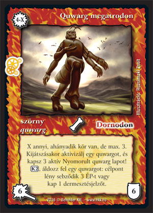 Szöveg: X annyi, ahányadik kör van, de max. 3. Kijátszásakor aktivizálj egy quwargot, és kapsz 3 aktív Nyomorult quwarg lapot! (K2), áldozz fel egy quwargot: célpont lény sebződik 3 ÉP-t vagy kap 1 dermesztésjelzőt.