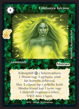 Szöveg: Költségéből 4_VP-t helyettesíthetsz 1 Sheran vagy 2 egyforma színű lap Semmibe dobásával. Max. 2 célpont lap a gyűjtőbe kerül. Minden lényed kap 1 izom- vagy 1 életjelzőt (vegyesen is lehet), VAGY húzz 1 lapot!