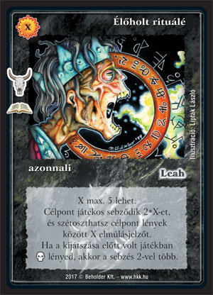 Szöveg: X max. 5 lehet. Célpont játékos sebződik 2*X-et, és szétoszthatsz célpont lények között X elmúlásjelzőt. Ha a kijátszása előtt volt játékban _élőholt lényed, akkor a sebzés 2-vel több.