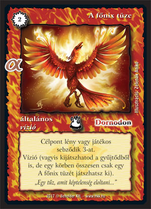 Szöveg: Célpont lény vagy játékos sebződik 3-at. Vízió (vagyis kijátszhatod a gyűjtődből is, de egy körben összesen csak egy A főnix tüzét játszhatsz ki).