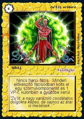 Kiadás: Chara-din visszatér Gyakoriság: ritka Lapszín (isten): Fairlight Típus: bűbáj Szöveg: Nincs harci fázis. Minden előkészítő fázisodban költs el egy szörnykomponenst és 1 VP-t, különben a gyűjtőbe kerül. Szinesítő szöveg: "Zu'lit, a nagy varázsló csodálatos dolgokra képes, de sajnos az árai is mesések..." Illusztráció: Markó Gábor