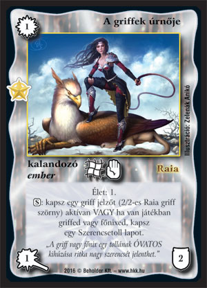 Szöveg: Élet: 1. (S): kapsz egy griff jelzőt (2/2-es Raia griff szörny) aktívan VAGY ha van játékban griffed vagy főnixed, kapsz egy Szerencsetoll lapot.