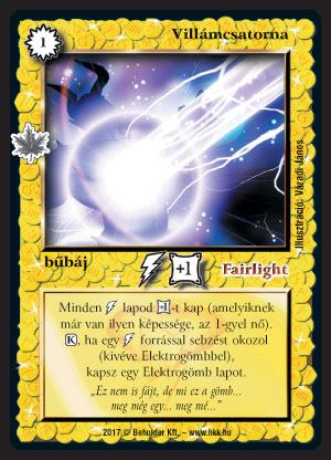 Szöveg: Minden _villám lapod [[1]]-t kap (amelyiknek már van ilyen képessége, az 1-gyel nő). (K), ha egy _villám forrással sebzést okozol (kivéve Elektrogömbbel), kapsz egy Elektrogömb lapot.