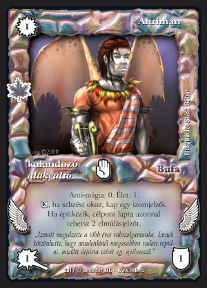 Szöveg: Anti-mágia: 0. Élet: 1. (K), ha sebzést okoz, kap egy izomjelzőt. Ha építkezik, célpont lapra azonnal tehetsz 2 elmúlásjelzőt.