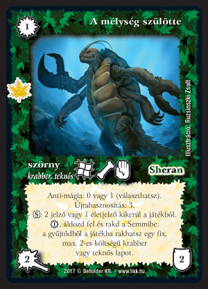 Szöveg: Anti-mágia: 0 vagy 1 (választhatsz). Újrahasznosítás: 3. (S): 2 jelző vagy 1 életjelző kikerül a játékból. 1_VP, áldozd fel és rakd a Semmibe: a gyűjtődből a játékba rakhatsz egy fix, max. 2-es költségű krabber vagy teknős lapot.