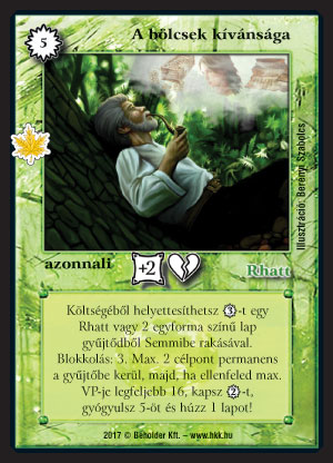Szöveg: Költségéből helyettesíthetsz 3_VP-t egy Rhatt vagy 2 egyforma színű lap gyűjtődből Semmibe rakásával. Blokkolás: 3. Max. 2 célpont permanens a gyűjtőbe kerül, majd, ha ellenfeled max. VP-je legfeljebb 16, kapsz 2_VP-t, gyógyulsz 5-öt és húzz 1 lapot!
