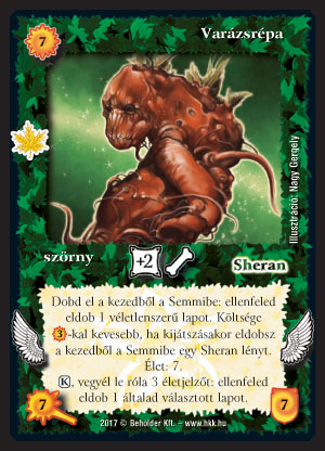 Szöveg: Dobd el a kezedből a Semmibe: ellenfeled eldob 1 véletlenszerű lapot. Költsége (3)-kal kevesebb, ha kijátszásakor eldobsz a kezedből a Semmibe egy Sheran lényt. Élet: 7. (K), vegyél le róla 3 életjelzőt: ellenfeled eldob 1 általad választott lapot.